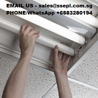 Office Energy Saving Lighting LED light Power saving concept. Asia man changing compact-fluorescent (CFL) bulbs with new bulb.